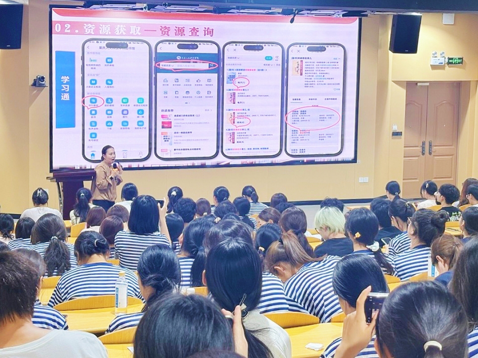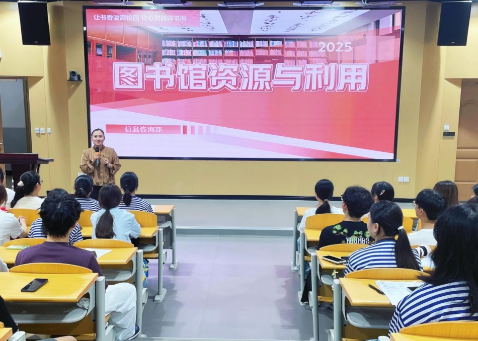 9月11日上午,张琳以“图书馆资源与利用”为主题进行讲解。她从图书馆整体布局与功能入手,详细介绍了学习空间、馆藏资源与数字平台,并结合实例讲解了图书查找、借阅方法和数字资源获取渠道,帮助新生掌握了便捷高效的学习技巧。同时,她还重点介绍了迎新季、读书月、书海寻宝等阅读推广活动,以及线上学习与咨询平台,鼓励新生充分利用图书馆这一学术与文化沃土,在书香浸润中不断成长。