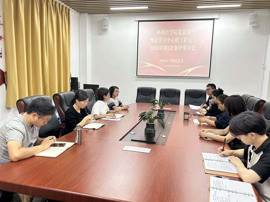 2025年9月24日,外国语学院党总支在宏识楼党员活动室召开理论学习中心组学习(扩大)2025年第5次集中学习会。学院党总支委员会成员、党政领导、党支部书记、专职组织员参加。会议由党总支书记彭奕奕主持。