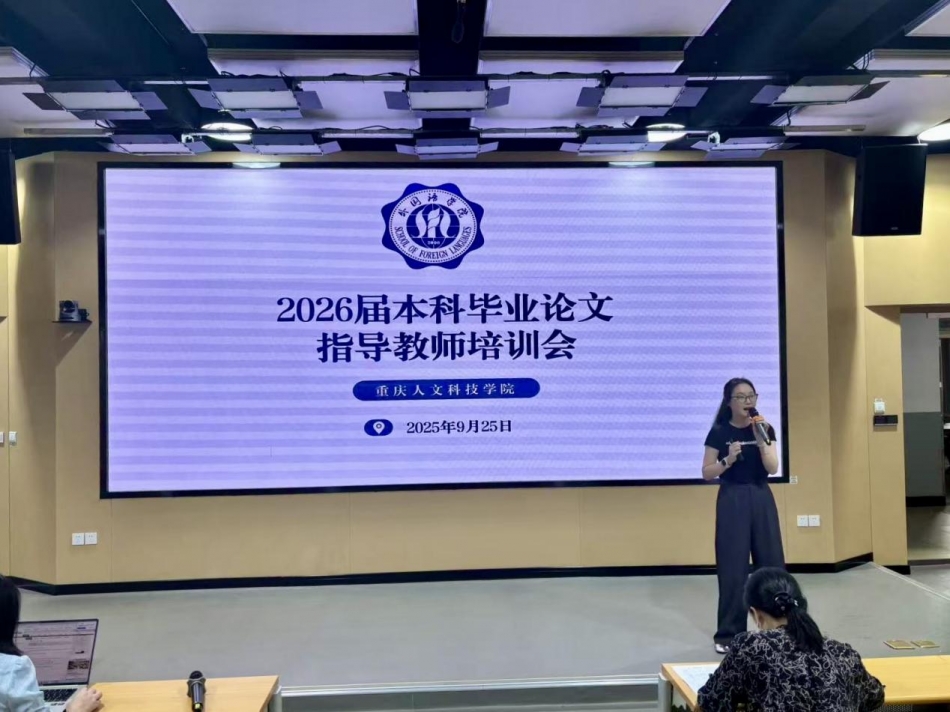 为规范2026届本科毕业论文工作,提升论文质量与指导水平,9月25日,外国语学院在宏识楼7208报告厅召开2026届本科毕业论文指导教师培训会。学院论文工作负责人陈青青主讲,学院领导及全体指导教师参会。