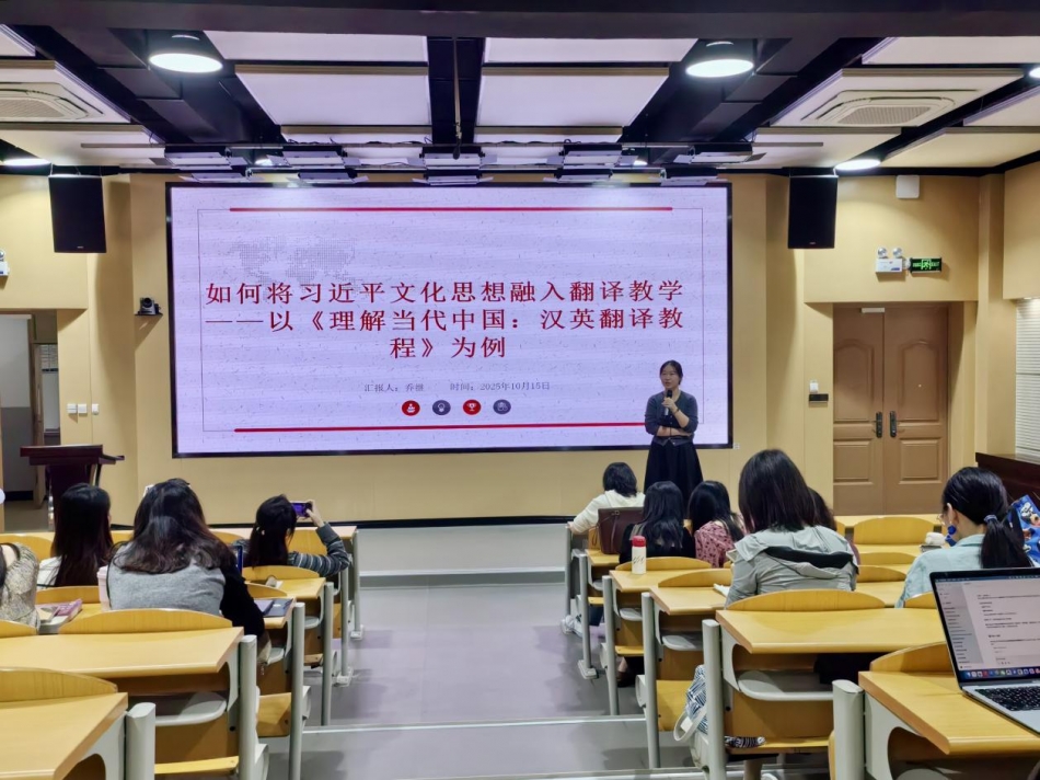 为深入践行习近平文化思想,落实立德树人根本任务,探索外语课程思政融合新路径,10月15日下午,外国语学院在宏识楼7208报告厅举办“以习近平文化思想引领外语课程教学”主题教研活动,由低年级教研室主任陈青青主持,全体专业组教师参与。