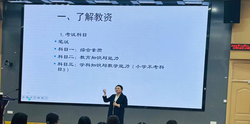 10月21日13:00,外国语学院在文渊楼9102教室开展入学教育系列讲座之“助力教资备考,共筑教师梦想”,帮助2025级新生开启教师资格证备考准备。本次讲座由教研室主任陈琳主讲,2025级全体新生参与。