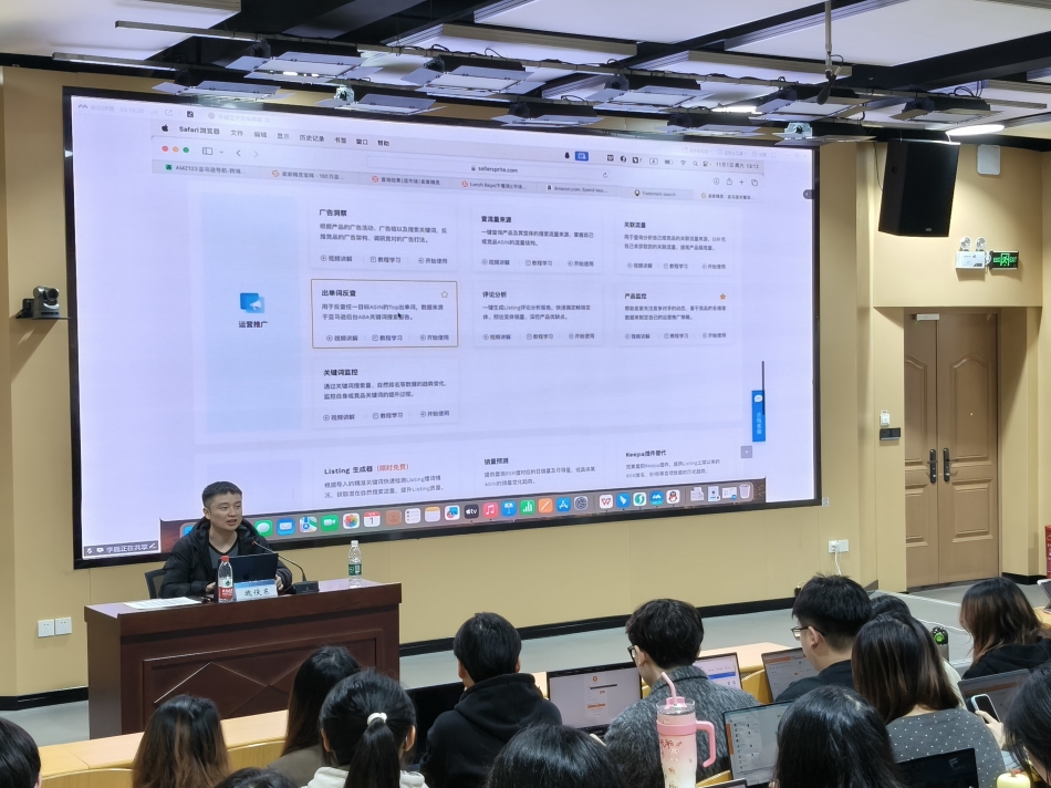 此次授课围绕跨境电商的定义、优势、市场调研、选品实训四大模块展开。魏侠来通过系统介绍阿里巴巴、amazon、Shopee等主流平台,解析B2B、B2C、C2C等典型模式,结合数据阐释行业四大优势,帮助学生搭建对跨境电商的认知框架;随后,聚焦市场调研,结合实例讲解选品的底层逻辑、注意事项、误区与陷阱、过程评估重点及选品方法,并通过互动环节强化了学生对营销、转化与数据化运营的岗位认知。