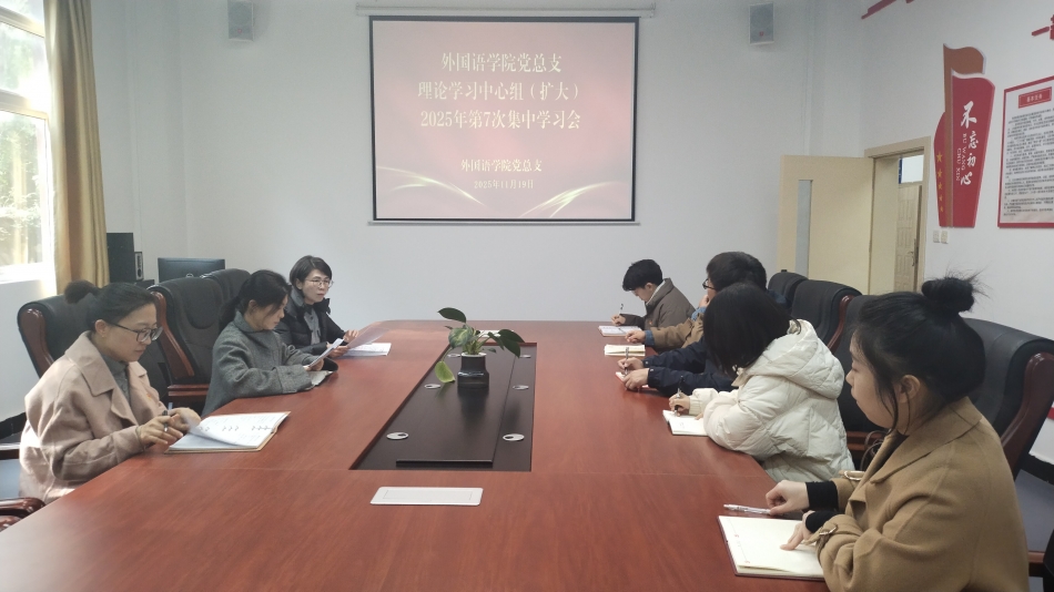 2025年11月19日,外国语学院党总支在学院党员活动室召开理论学习中心组学习(扩大)2025年第7次集中学习会。学院党总支委员会成员、党政领导、党支部书记、专职组织员参加。会议由党总支书记彭奕奕主持。
