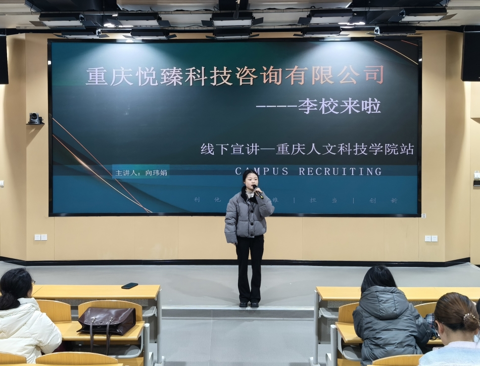 为拓宽学生实践渠道,强化就业认知与岗位体验,12月12日13:00,外国语学院于宏识楼7208报告厅成功开展“李校来啦”英语语言陪练师项目宣讲会。学院特邀重庆悦臻科技资讯有限公司宣讲师向玮娟作主讲嘉宾,共80余名学生参加。